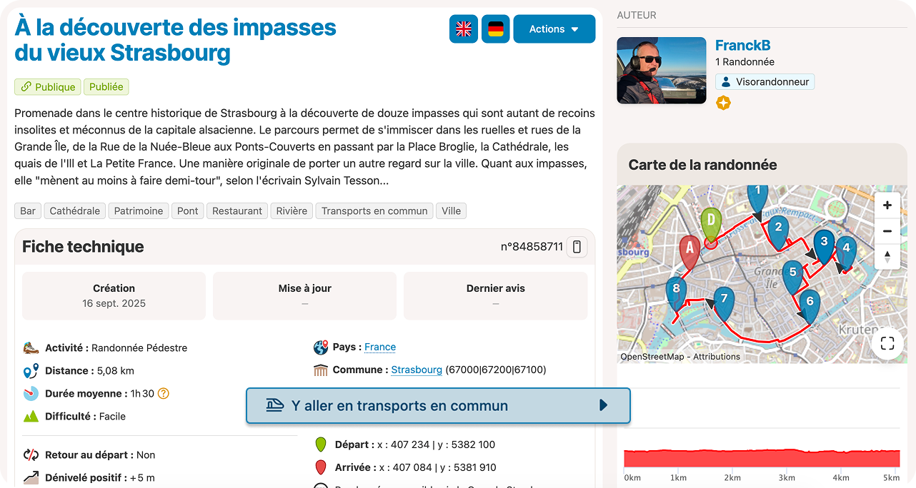 Un bouton “Y aller en transports en commun” est disponible dans la fiche technique des randonnées dont le départ se situe à proximité d’une gare SNCF.