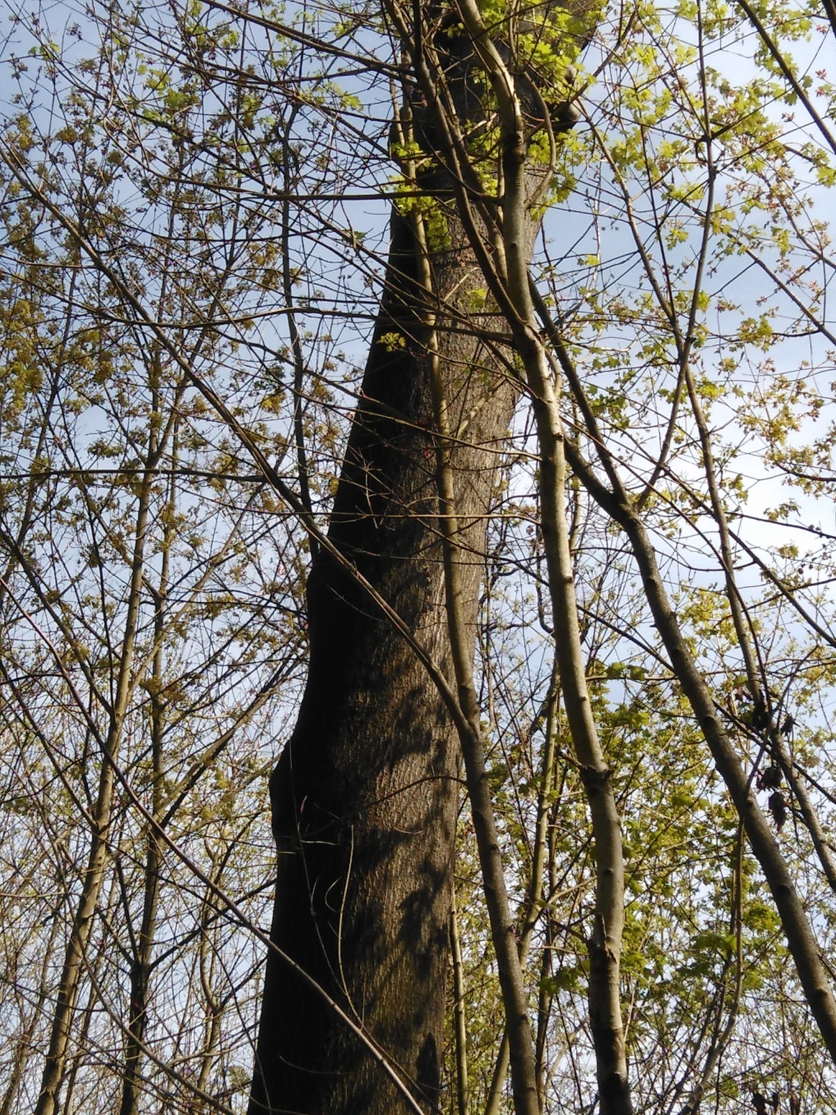 Entre le point 3 et 4, dans la zone de perchis après la futaie, sur la droite du chemin se dirigeant pour cette portion vers l'Est, nous avons eu la surprise de découvrir cet arbre géant.. Entouré de jeunes hêtres, son écorce en diffère totalement et je n'ai pas reconnu celle d'un chêne. J'ai pensé à celle d'un orme. Le feuillage d'automne tombé au sol n'a révélé que celui de feuilles et de faines de hêtres.Le toupet très élevé aux feuilles naissantes ne permettait pas l'identification.