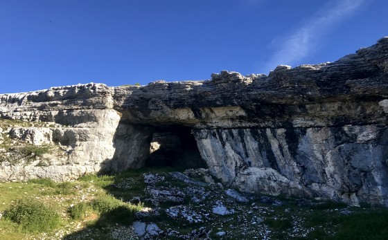 Si l'on décide de ne pas suivre la crête pour aller au sommet, mais que l'on descend voir la dépression de la doline (cote IGN 1799m - 45.420019 , 5.906571 - w3w soulagement.magique.insister) juste plein Est en redescendant sous la sortie de la fissure cf. photo de l'étape 3, on pourra y voir un impressionnant pont / arche calcaire.