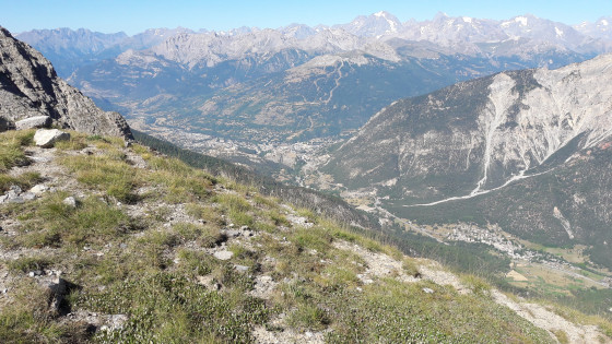 Du sommet du Janus, vue sur le massif des Ecrins. Au carrefour des vallées, Briançon, et au dessus de Briançon, les premières pistes des ski de Serre-Chevalier 1200.