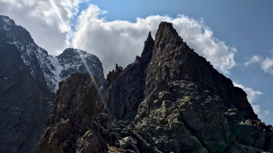 Une petite brèche est située après le premier ressaut rocheux de l'arête de la Bosse de la Momie. L'arête que l'on voit ici se contourne par la droite par des vires faciles en bon rocher, mais nécessitant une pleine concentration car au-dessus du vide.