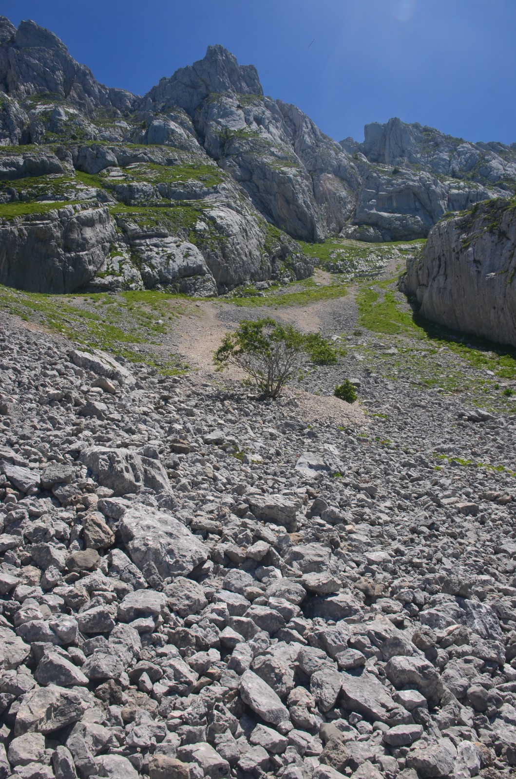 Photo prise au début de la Combe, vers le haut. Le chemin de Péronnard suit la base des rochers, un peu au dessus de l'arbuste.