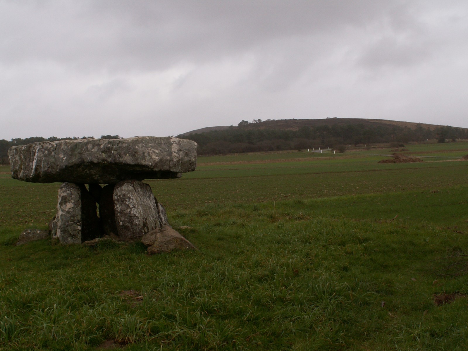 Dolmen isolé en bordure de champ. En arrière-plan, le Ménez-Hom (330m)