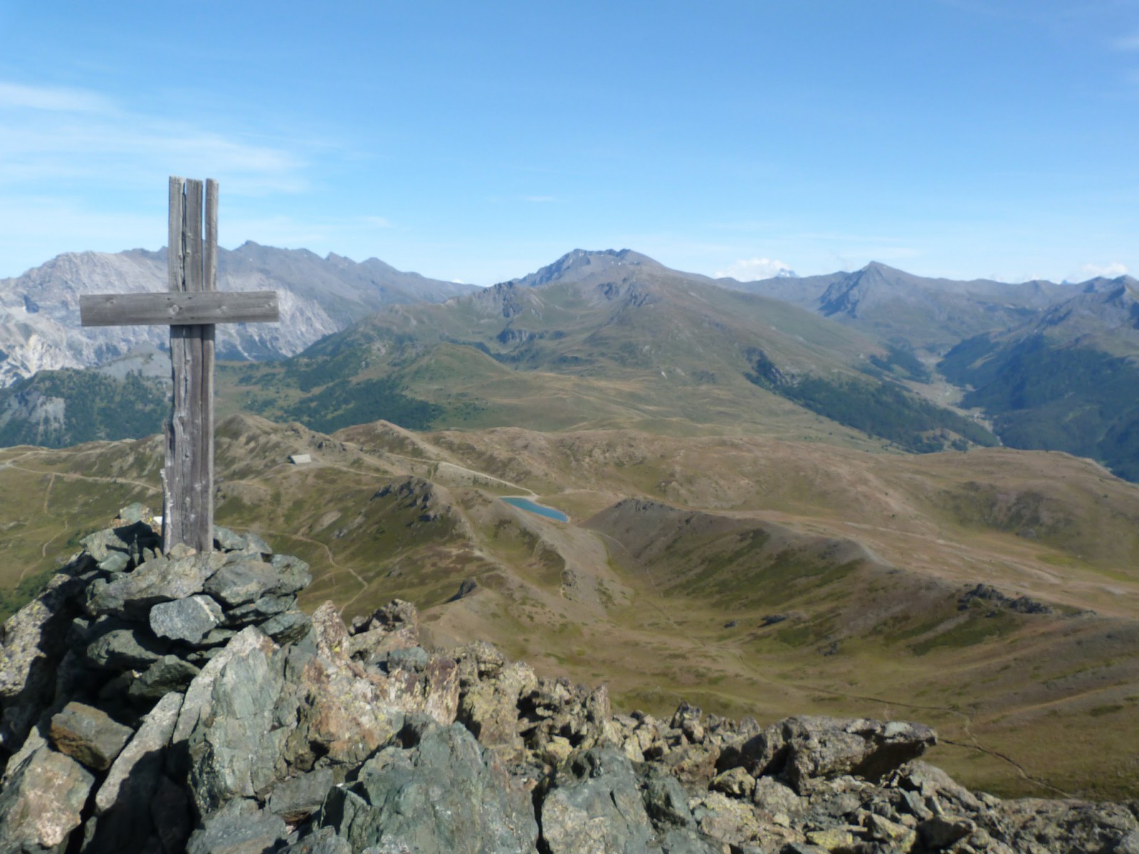 De lacroix au sommet du Charvia, on voit très bien ce qui m'attend le lendemain... et ce qu'il resque pour la journée. Descendre jusqu'à la cabane à gauche du Lac Gignoux. Puis continuer de bosse en bosse vers la droite avant d'obliquer à gauche pour descendre au refuge