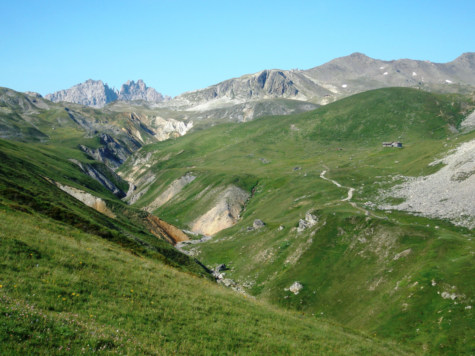 Passée une montée depuis le parking du Lavoir, vous verrez ce panorama avec un choix à faire : GR 5 à gauche (itinéraire prévu) ou variante : traverser le vallon à droite et suivre N le chemin qui serpente de grange en grange, dans un dédale de bunkers (!), il même tout droit au refuge du Thabor.