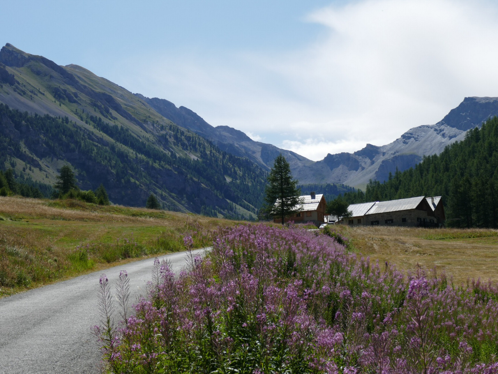 Sur la route menant à Chaurionde, le hameau de la Cime du Mélezet. Au fond, le col Tronchet. Au premier plan, des épilobes.