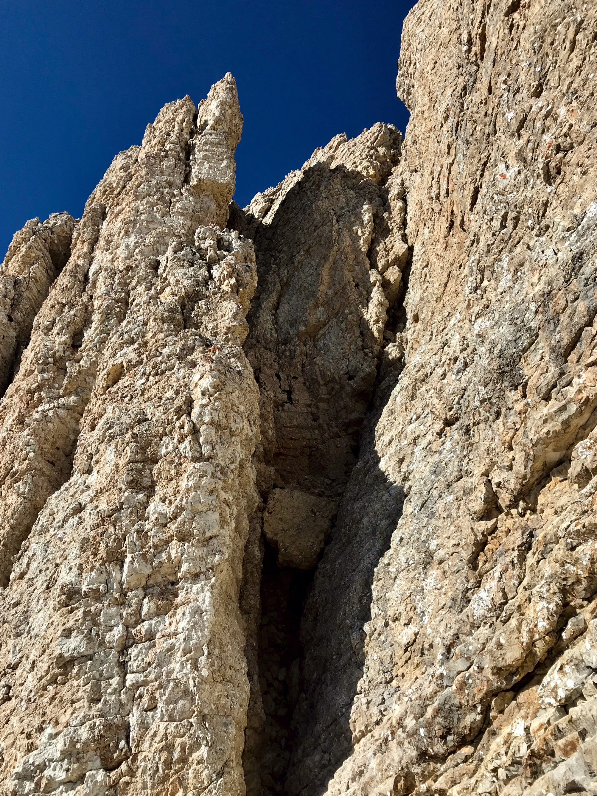 Un tout petit cairn avant la tour de la photo précédente indique la base de la seconde chatière, facilement reconnaissable grace au gros bloc rocheux qui est coincé en son centre. Il faut passer sous ce bloc pour monter, et sortir par la gauche pour emprunter la suite de la chatière.