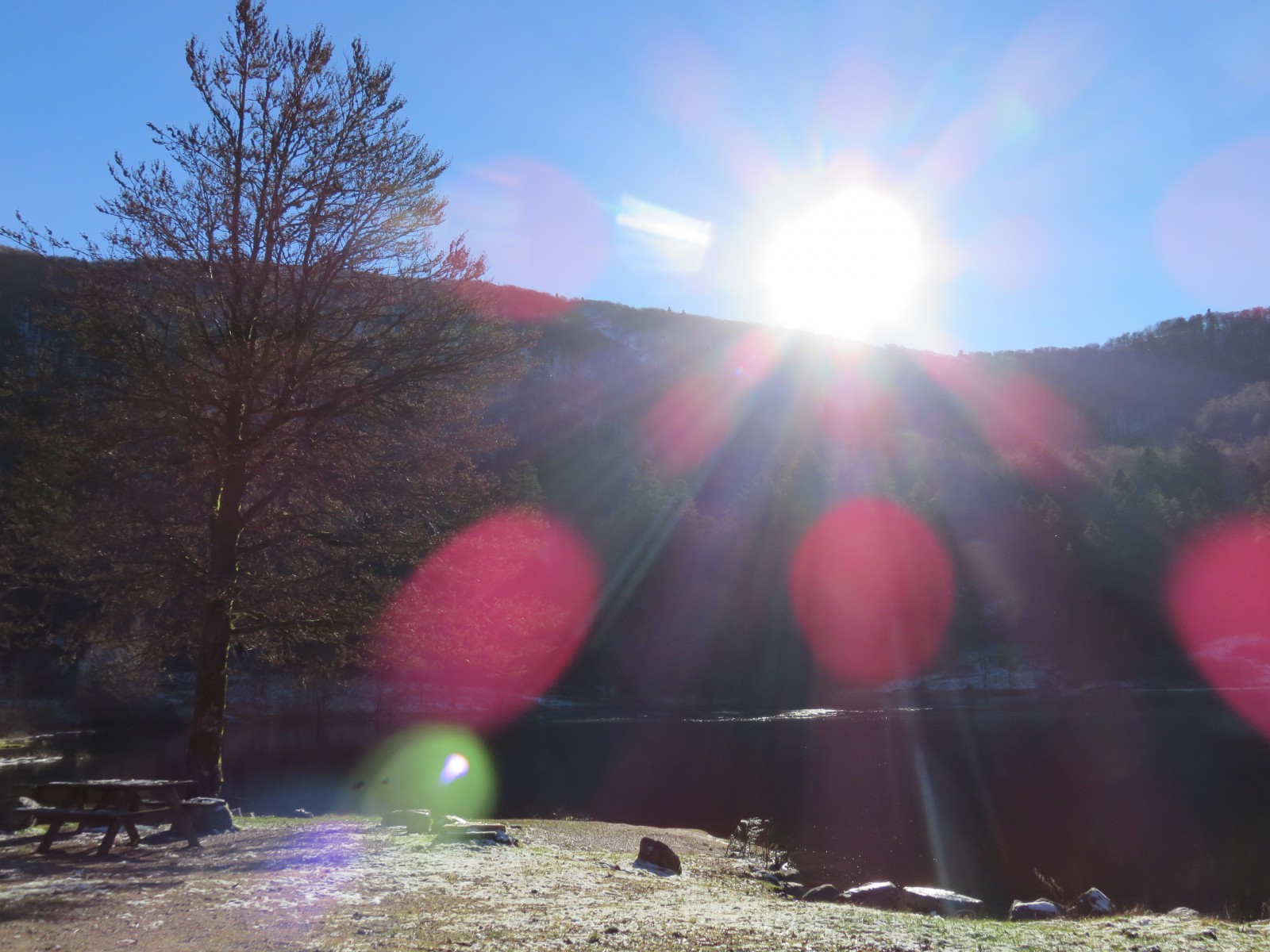 Les rayons du soleil de midi, ce 23 décembre, arrosent le lac de Blanchemer. A gauche du soleil, le Rainkopf où nous allons monter.