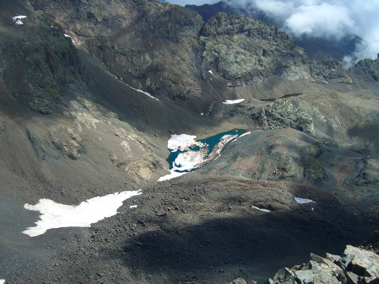 Photo prise du sommet le 14 septembre 2018 : contrairement aux autres années illustrées, malgré un été particulièrement chaud, la neige accumulée l'hiver passé est loin d'avoir fondu cette année.
