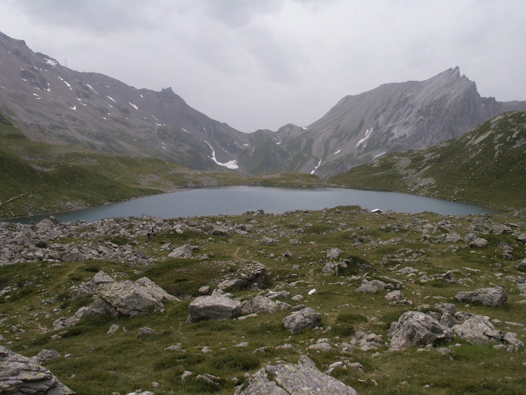 Au premier plan, le lac Jovet. Au fond, le col du Bonhomme et les aiguilles de la Pennaz sur la droite.