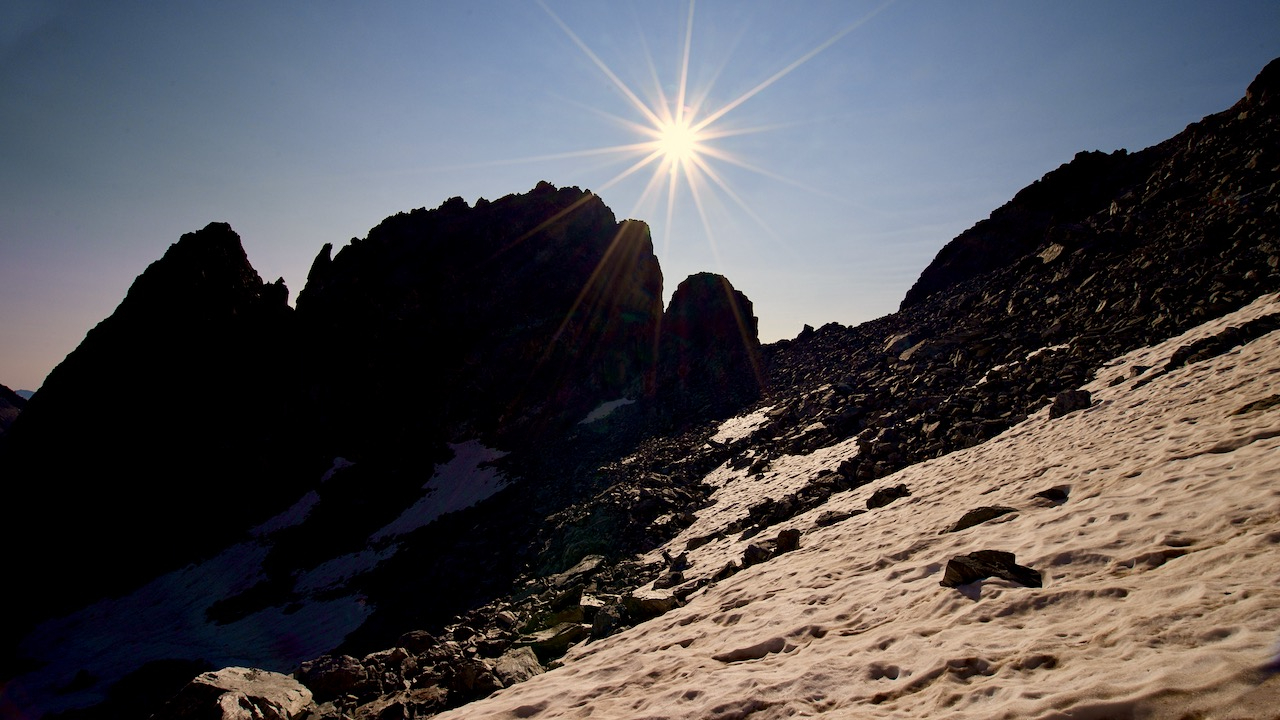 Le sommet à gauche du soleil est l'Aiguille de la Combe. Il est possible de la gravir en mode randonnée par la voie de descente des alpinistes (je décrirai ceci à l'occasion). À sa gauche se trouve la Pointe Elizabeth. À sa droite, le large col est celui de la Combe.