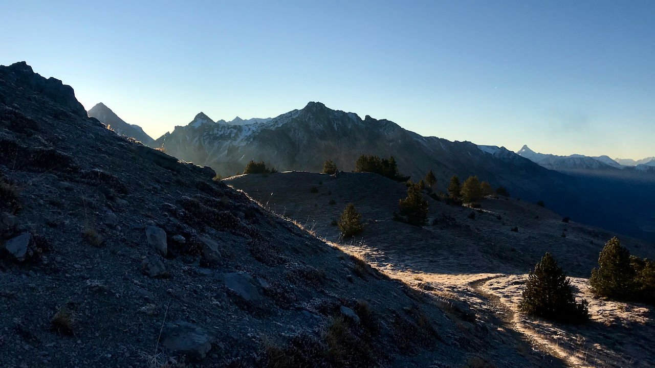 Au Sud-Est, de gauche à droite, les silhouettes des sommets franco-italiens découpent le ciel: la Punta Charrà sur la gauche, le Rocher de Barrabas, la Roche des Prés et la Pointe des Grand Becs à l'arrière plan, le Sommet du Guiau et la Pointe de Pécé à l'ombre, et à l'horizon, l'omniprésent Pic de Rochebrunne.