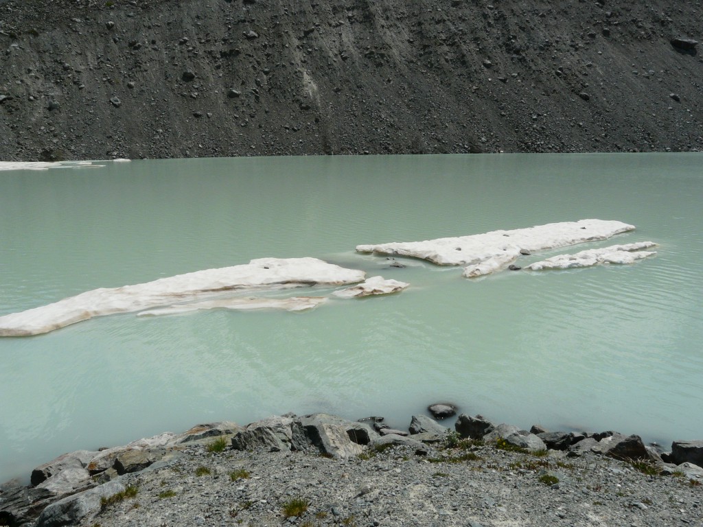 Quelques plaques de neige-glace résistent encore dans le lac.