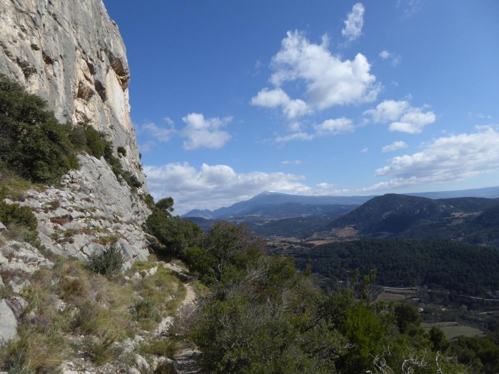 Le sentier qui longe la falaise avec une vue sur le Ventoux