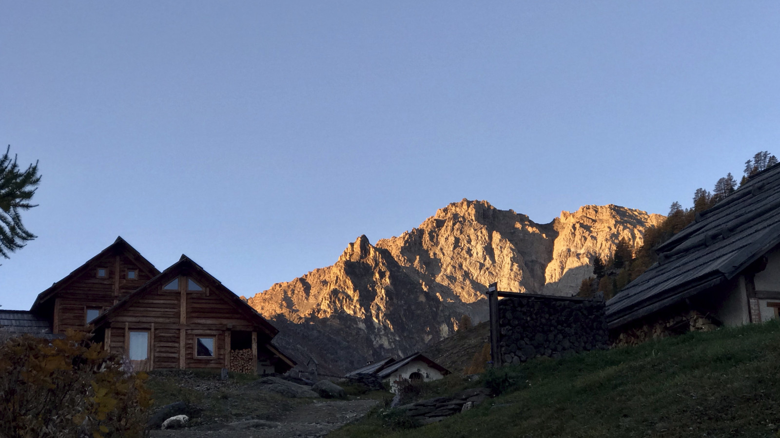 Les chalets de Buffère sous la Tour Noire et la Pointe de Buffère au lever du soleil.