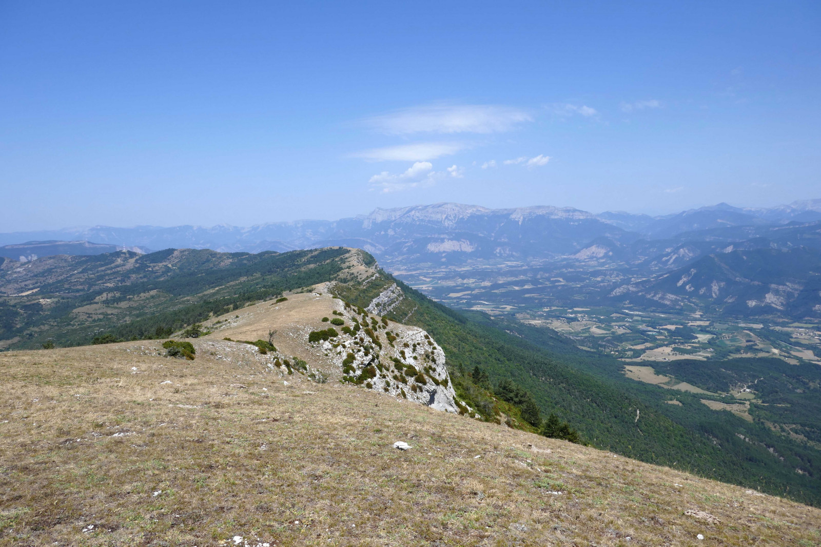 Voici une vue générale des crêtes d'Aucelon en direction du nord avec la vallée de la Drôme sur la droite et le massif du Glandasse en arrière plan