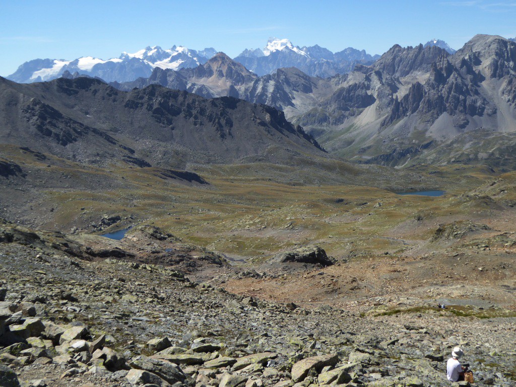 La barre des Ecrins au centre Le lac des Muandres à gauche et le Lac Rond en contrebas