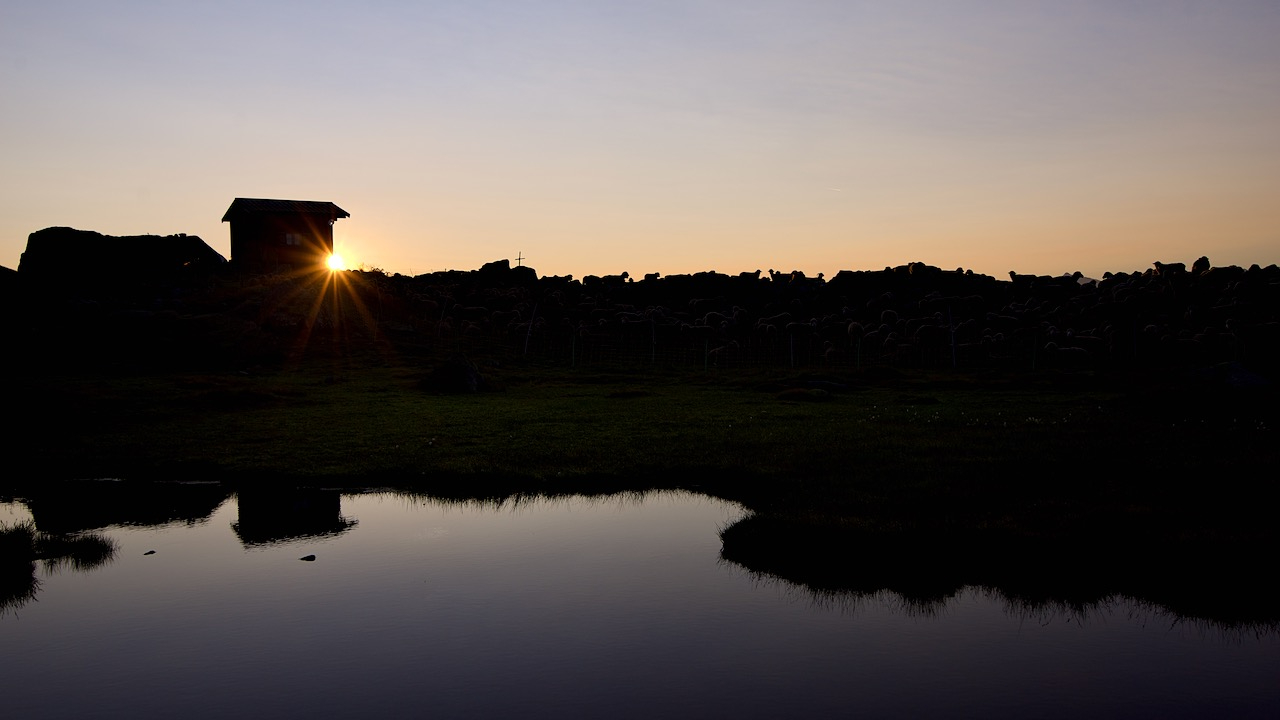Lever de soleil sur la cabane pastorale du Lac de la Combe