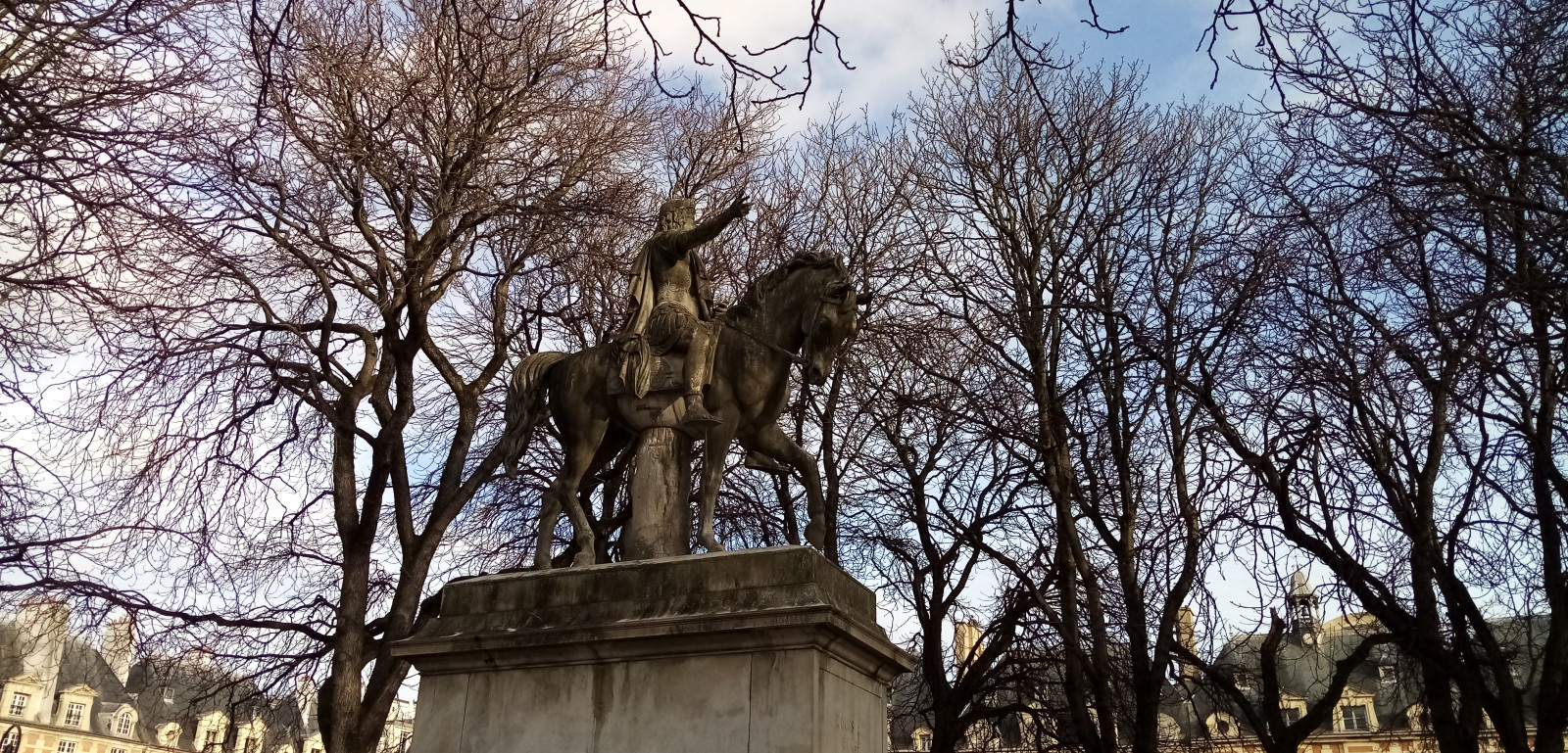 Statue équestre au milieu de la Place des Vosges (décembre 2023).