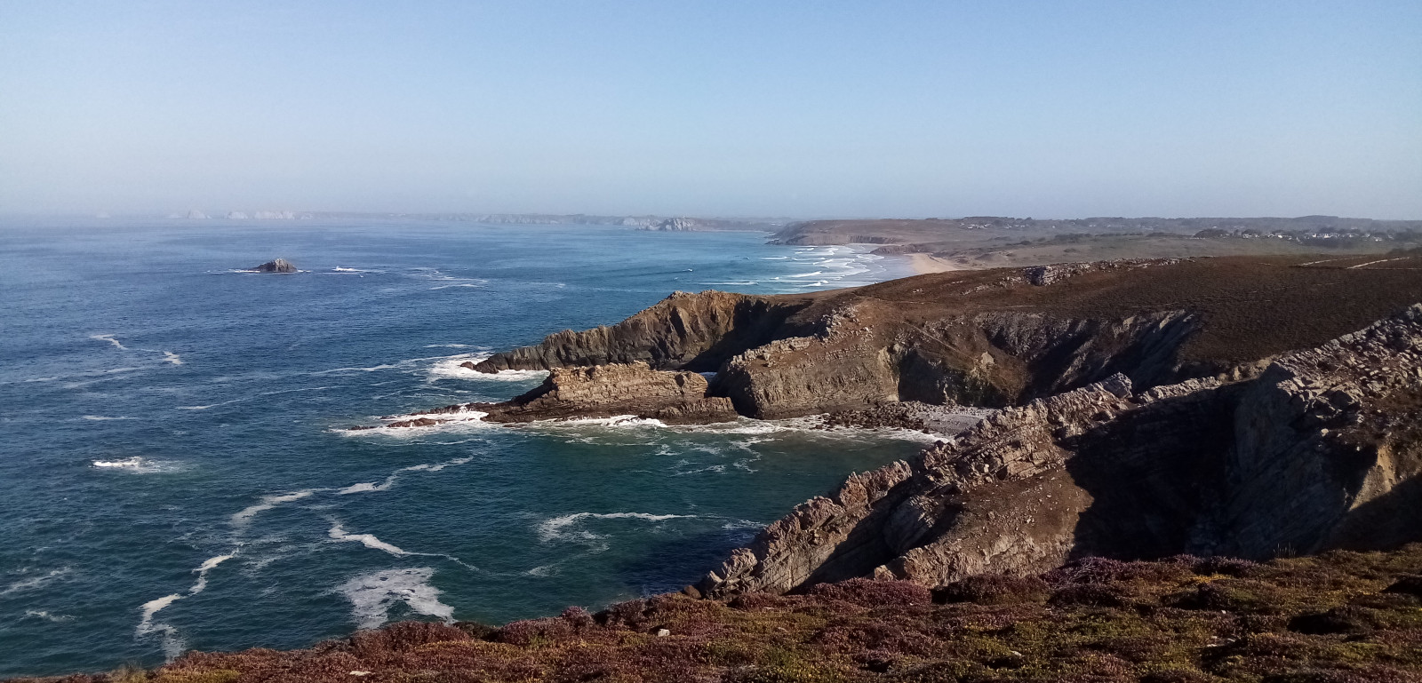 Prise de vue dans le sens inverse de la marche, avec la Pointe de Pen Hir et les tas de Pois à l'arrière-plan (août 2022).