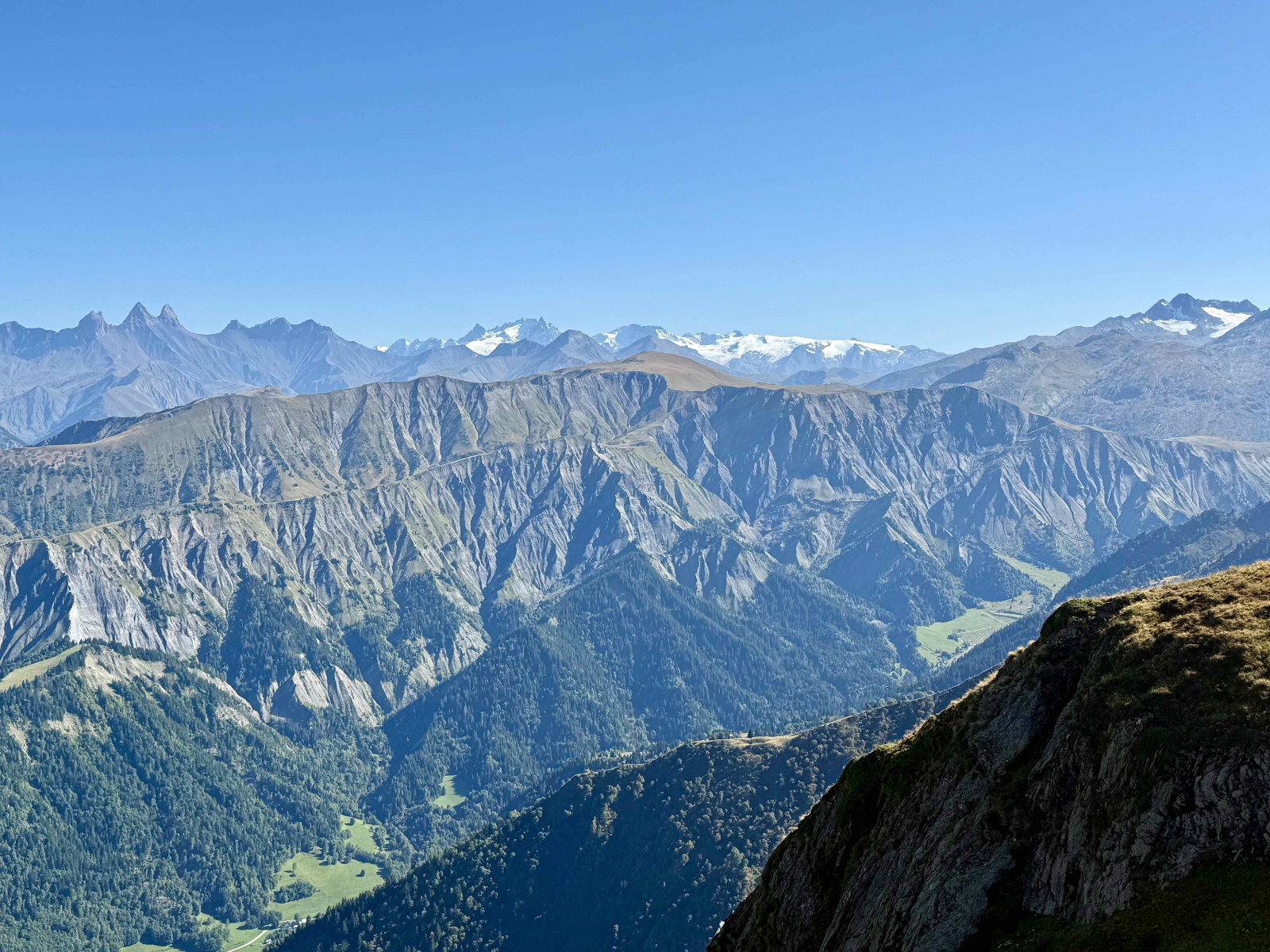 du point haut, vers Aiguilles d’Arves, Meije, Glacier du Mont-de-Lans et Grand Sauvage, par dessus l’Ouillon