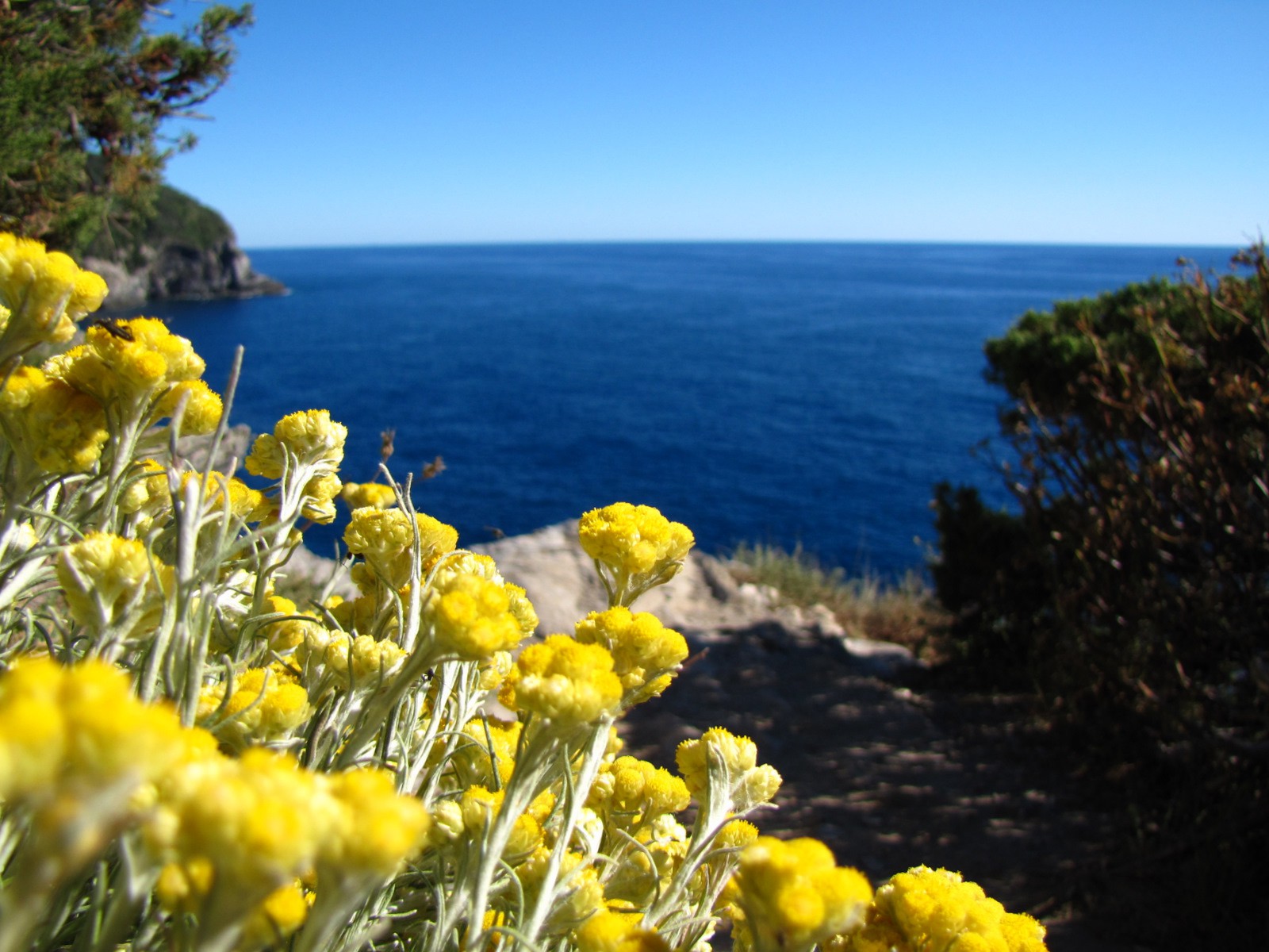 Cinéraire maritime sur le sentier de la Pointe des Chevaliers. Vue Sud-Ouest, Escampobariou dans le fond.