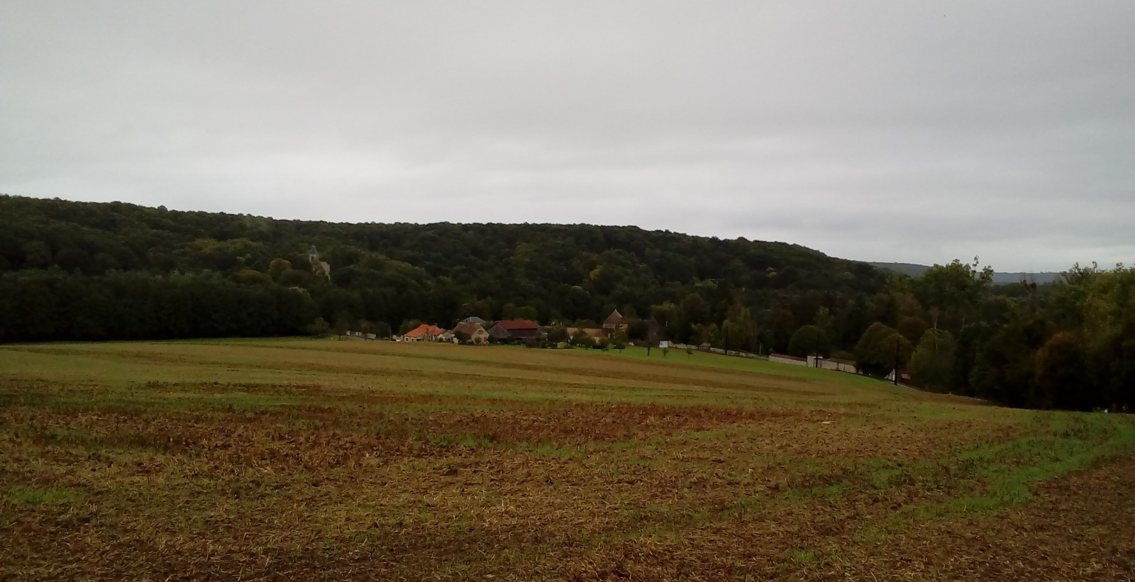 À gauche, le clocher de l'église qui émerge de la forêt et, à droite, un pigeonnier (octobre 2019).