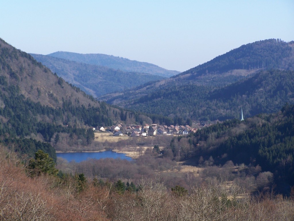 Le village de Sewen vu depuis le barrage du lac d'Alfeld. C'est le dernier village de la vallée de la Doller. Devant, le Lac de Sewen et ses tourbières.