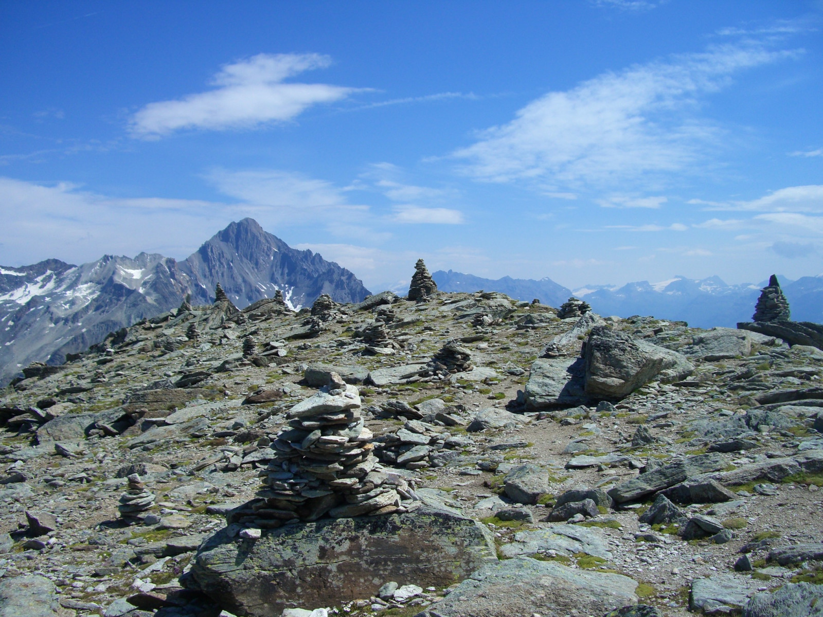Le plateau sommital hérissé de cairns, devant la Dent Parrachée