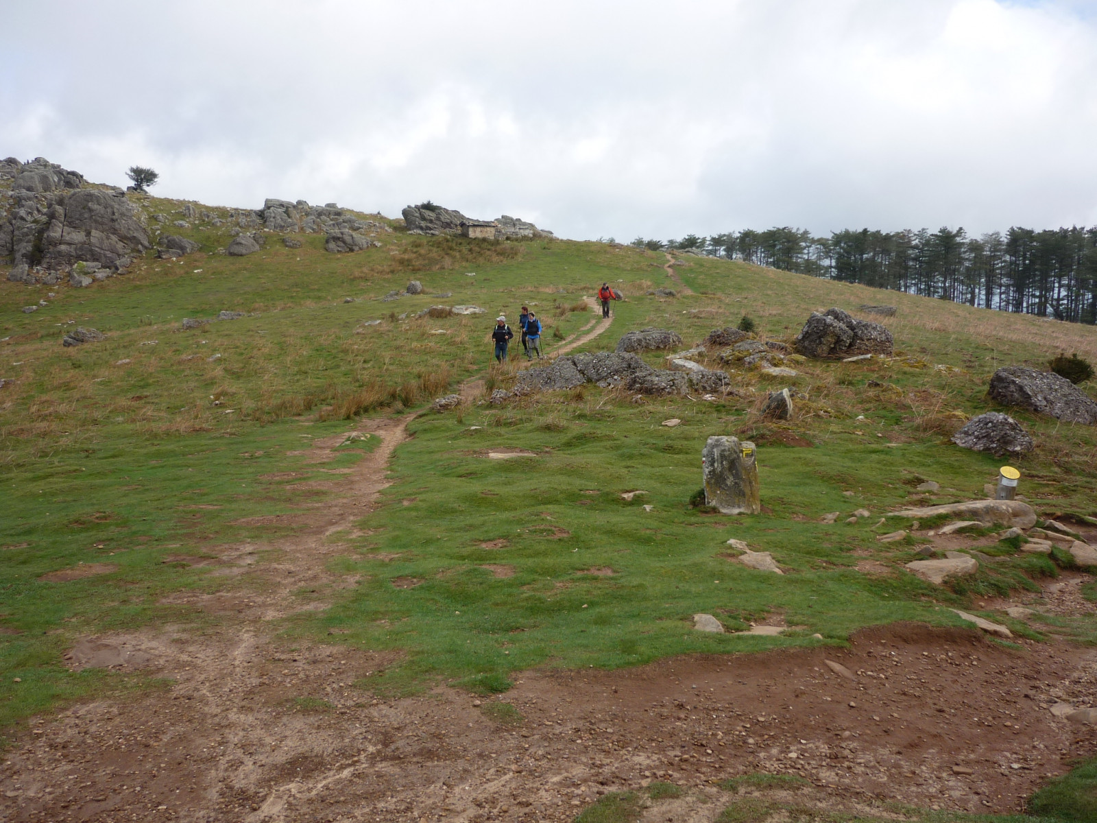 À la sortie du plateau Ihizelai 3, juste avant la montée à la Rhune. On voit la 2e bergerie. Sur la droite on aperçoit la cîme des pins, les randonneurs coupent par une trace en évitant l'angle droit du circuit tracé.