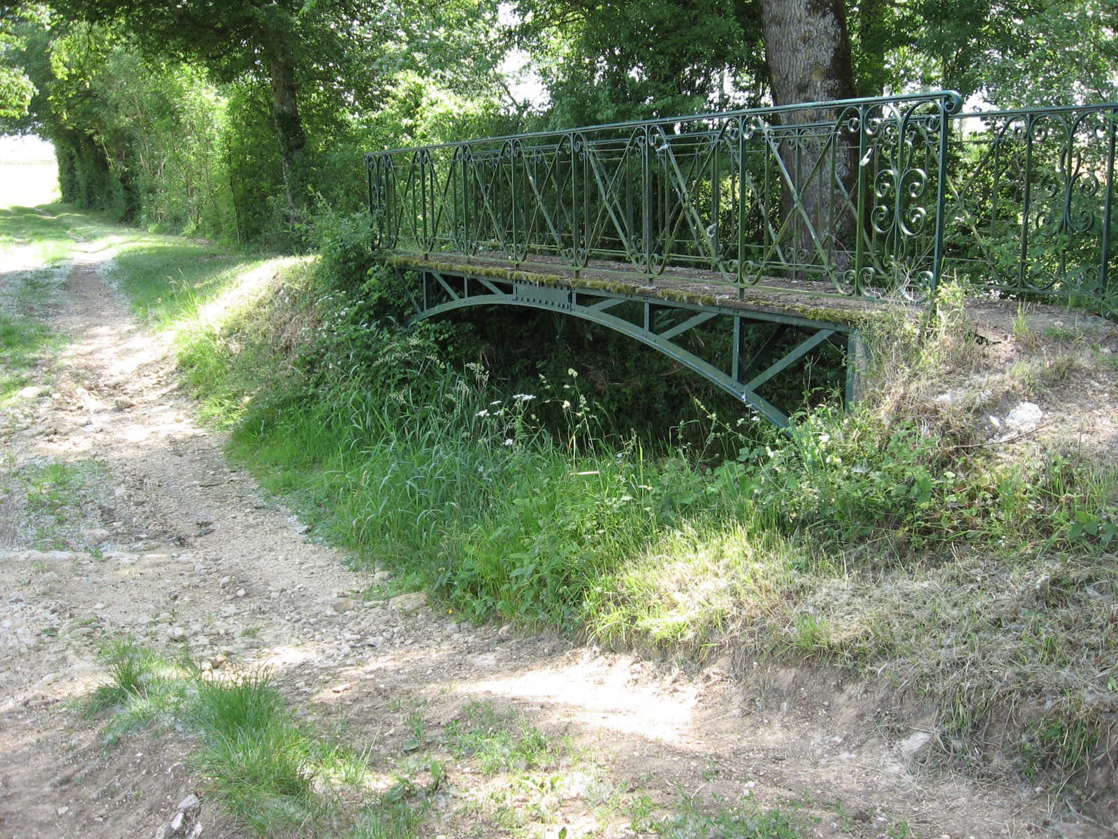 Chemin de St Jacques de Compostelle.Passerelle rénovée par un bénévol. Sur la photo le Langis est à sec, et le gué est praticable, En hiver, le passage est plus difficile.