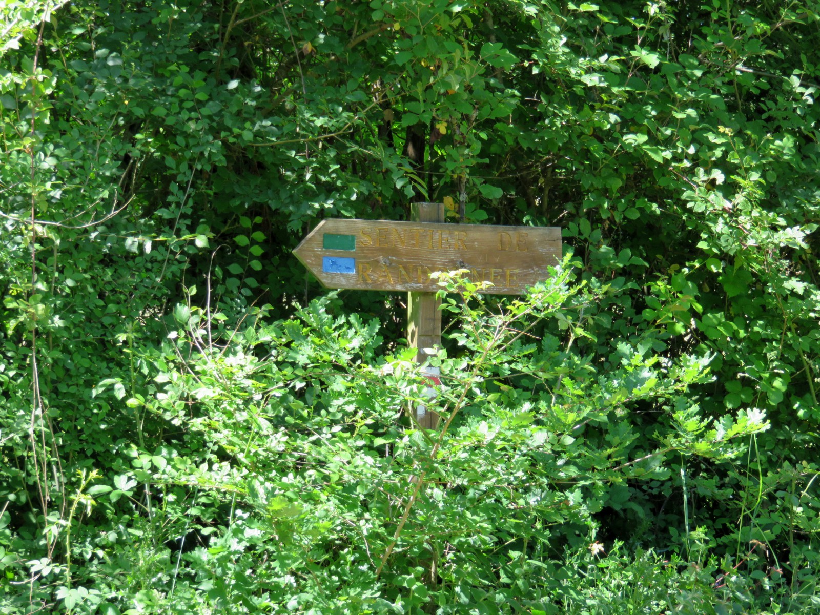 Suivre à droite le balisage vert et bleu et quitter le GR