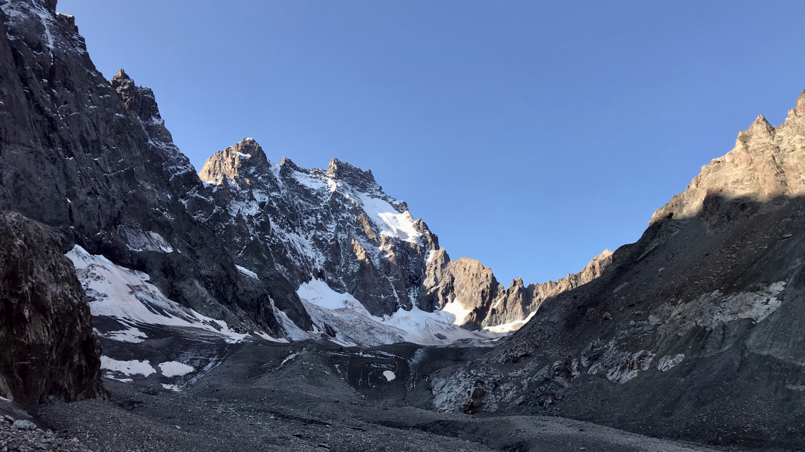 La montée de la moraine en rive droite du Glacier Noir supérieur est de loin le passage le plus difficile de la randonnée. Une fois atteint le sommet de cette moraine, la vue porte vers le Col de Coste Rouge, son Aiguille et ses Dents sous l'Ailefroide Occidentale.