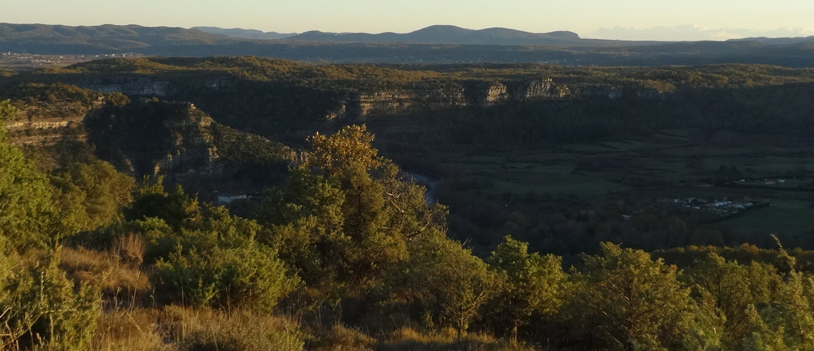 La plaine du Chassezac (dans l'ombre) et les falaises du Bois de Païolive vus de la colline du Puech, en arrivant à la chapelle.
