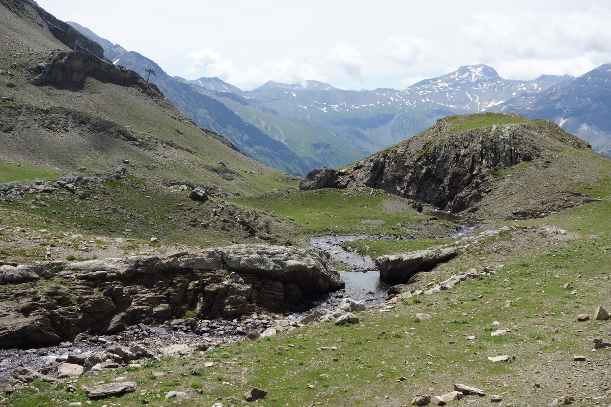 En descendant du lac des Estaris par la piste côté est, on découvre ce superbe endroit, avec prairie, fleurs et cascade.