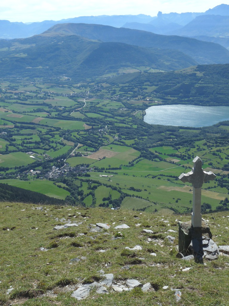 Derrière la croix, nous pouvons voir le lac de Pierre Châtel et, au fond, la chaîne du Vercors avec le Mont Aiguille.