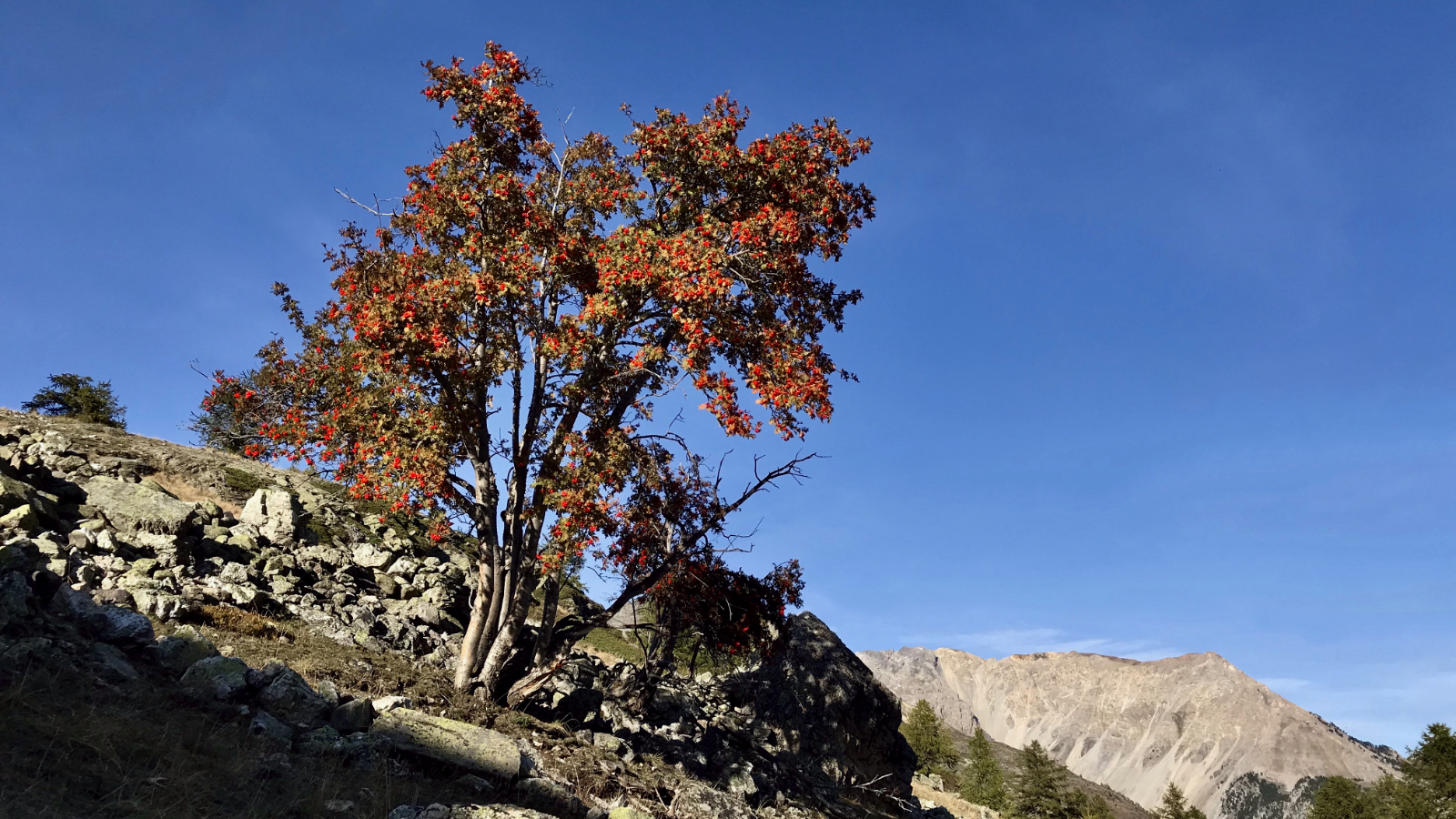 Un sorbier de l'oiseleur croule sous ses baies rouges.