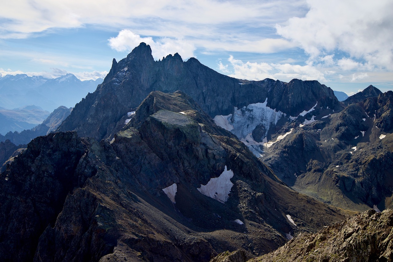 La vue au Sud porte sur le Grand Pic de Belledonne et son arête Nord qui en est la voie normale d'ascension.