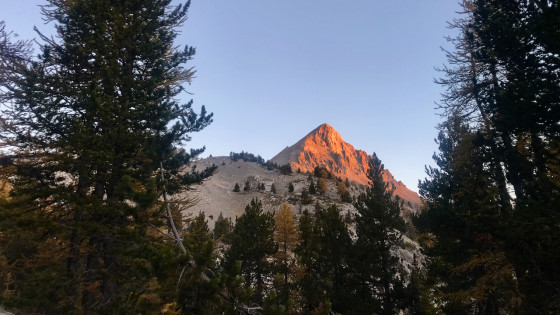 Sur le GR 5B, à la limite entre l'étage subalpin et alpin, les premiers rayons du soleil donnent sa couleur à l'Aiguille Rouge.