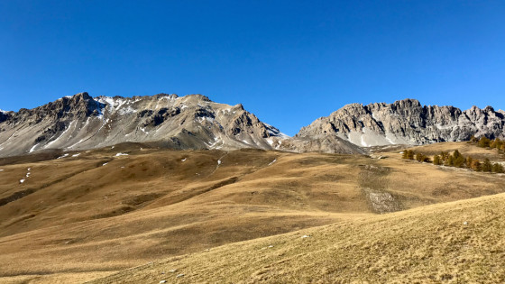 Les trembles jaune vif des Clapières forment une tache d'or sous la Crête du Queyrelin.