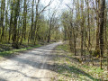 (6) Arrivé à la digue, empruntez-la, jusqu’à ce qu'elle tourne sur la droite. Prenez la descente sur la gauche, traversez un petit pont de bois et entrez dans la forêt. Traversez à nouveau la ligne de chemin de fer puis tout droit rejoignez le village d'Aspach-Le-Bas, jusqu'au parking de l'église (D/A).