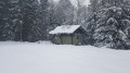 (2) Lorsque la route vire à gauche (cote 895), prendre le chemin sur la droite balisé en Jaune et chausser les raquettes. Suivre la piste forestière jusqu'à la ligne haute tension.