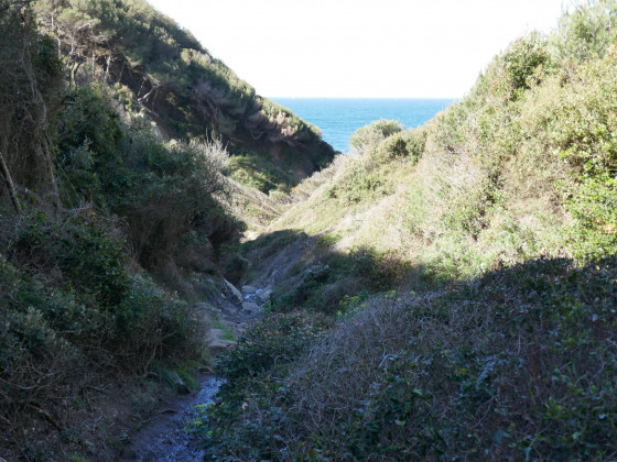La jolie petite plage la plus proche du parking du mont Salva combine des zones de petits galets et de fin sable gris. C'est un coin très tranquille car son accès, un peu "casse-gueule", se fait par un petit sentier très abrupt nécessitant quelques bonnes aptitudes physiques. Elle est limitée au nord par la pointe de Mourret que l'on voit ici.
