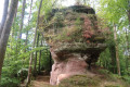 (10) Pour faire le tour du rocher, suivre l'étroit sentier derrière le banc qui passe entre deux rochers et poursuivre sur le même repère Triangle Bleu (ce très gros rocher en grès rose garde quelques traces d'un très ancien habitat). La circulaire du rocher ramène au chêne.