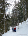 (D/A) Marcher prudemment, raquettes à la main, sur la route qui monte au chalet du Gounefay - Grand Taureau. Laisser sur la gauche les maisons des Jantets. Poursuivre sur la route pour atteindre un grand carrefour de routes et pistes.