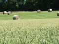 (8) Juste avant un lotissement en construction (2019), tourner à gauche dans un chemin d'exploitation bordé de maisons à main gauche. Suivre tout droit ce large chemin arboré, atteindre une petite clairière et continuer tout droit. Longer à droite la bordure d'un champ (respecter les cultures) et descendre pour trouver la continuité du chemin. Le suivre à droite, passer près d'une discrète fontaine, à main gauche, et continuer la large allée en bordure de prairies jusqu'à une route (D57). Remonter par la droite cette route, bande herbeuse du côté gauche.