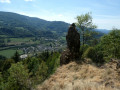 (2) Après avoir profité du panorama offert, poursuivre la montée sur une petite cinquantaine de mètres et atteindre une bifurcation. Quitter le GR® et partir à droite sur un plus petit sentier. Celui-ci effectue une large courbe à droite et rejoint la chapelle.