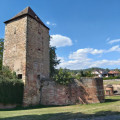 (5) Passez sur le pont à droite, puis la route à gauche. Traversez un 2e pont avec une petite écluse à votre gauche et virez de suite à droite sur la piste cyclable/piétonne. Elle passe entre les remparts du centre ville et le ruisseau. La piste débouche sur la Rue Stanislas, à votre gauche la Tour Schartenturm du XIVe siècle qui faisait partie du mur d’enceinte du monastère.