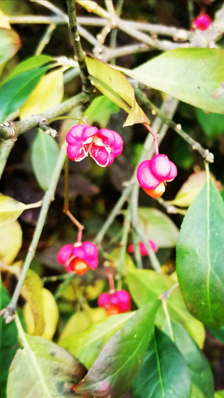 Le long du chemin on peu voir des fusains d'Europe. Appelé aussi bonnet de prêtre ou bonnet d'évêque, c'est un arbuste ou un petit arbre de la famille des Celastraceae