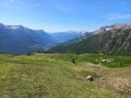 (13) À noter que de là, il est possible de descendre sur "Chantemerle" par un chemin bien pentu. Mais aujourd’hui, nous redescendrons du même côté. Faire demi-tour et reprendre le même chemin jusqu'aux 2 télésièges. Ensuite, après un virage et à la 3ème épingle, arriver au départ de la piste de ski repérée à la montée.